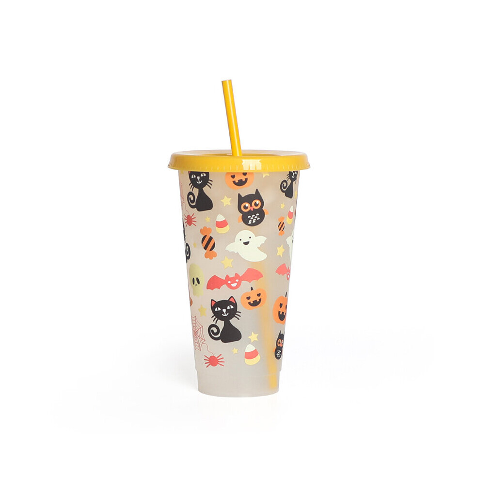 (a-Yellow) 710ml Halloween Straw Cups With Lid Creative Discoloration When Cold Drink Water Bottle Reusable Plastic Portable Coffee Mug