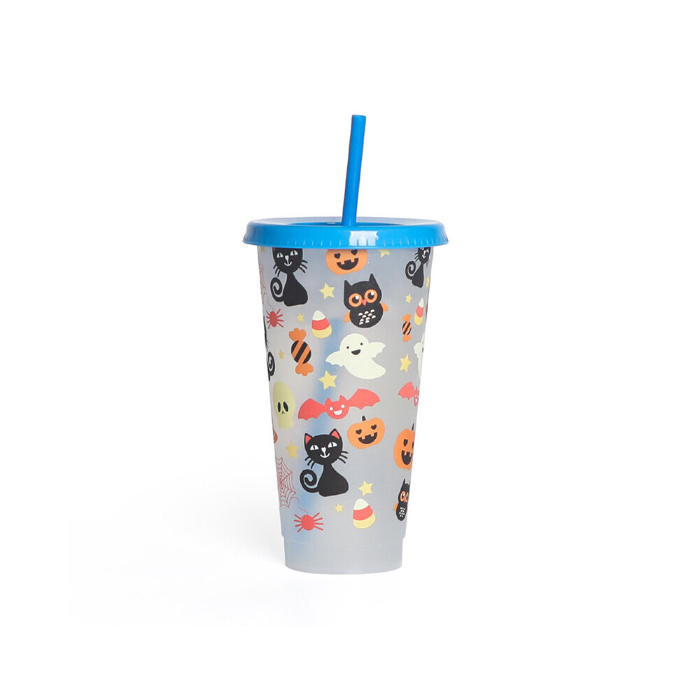 (a-Blue) 710ml Halloween Straw Cups With Lid Creative Discoloration When Cold Drink Water Bottle Reusable Plastic Portable Coffee Mug