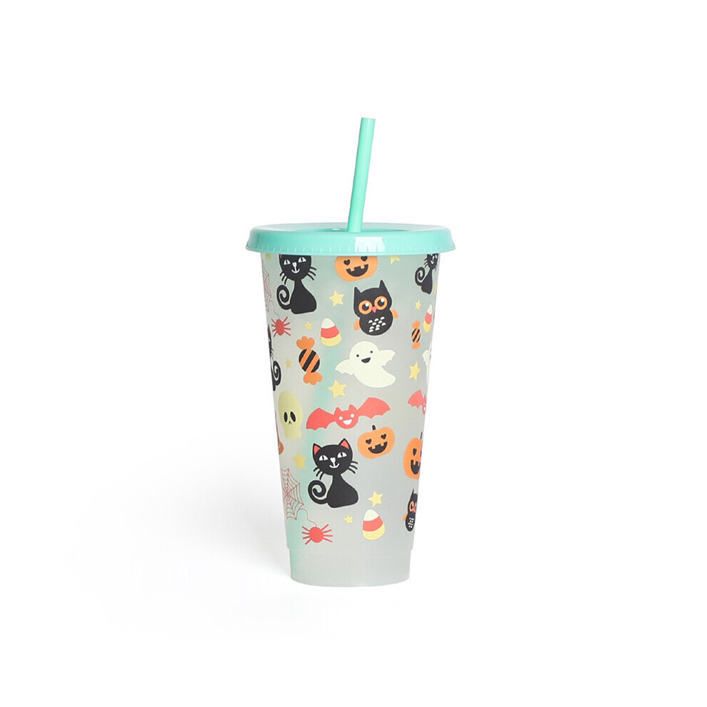(a-Green) 710ml Halloween Straw Cups With Lid Creative Discoloration When Cold Drink Water Bottle Reusable Plastic Portable Coffee Mug