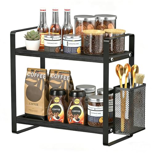 Womanht 2 Tier Countertop Organizer for Kitchen Bathroom Multi-Functional Coffee and Tea Station Organizer, Makeup Organizer and Kitchen Standing Shelf, Spice Rack Storage Shelf (Black)