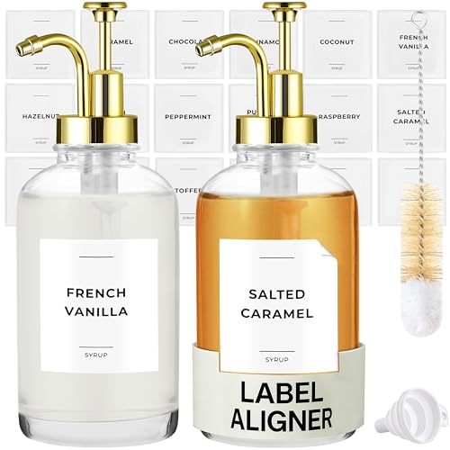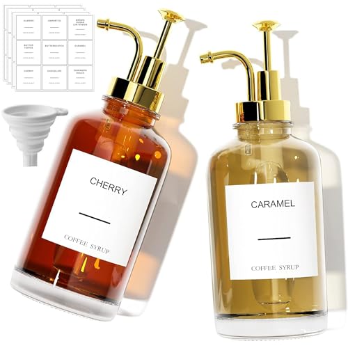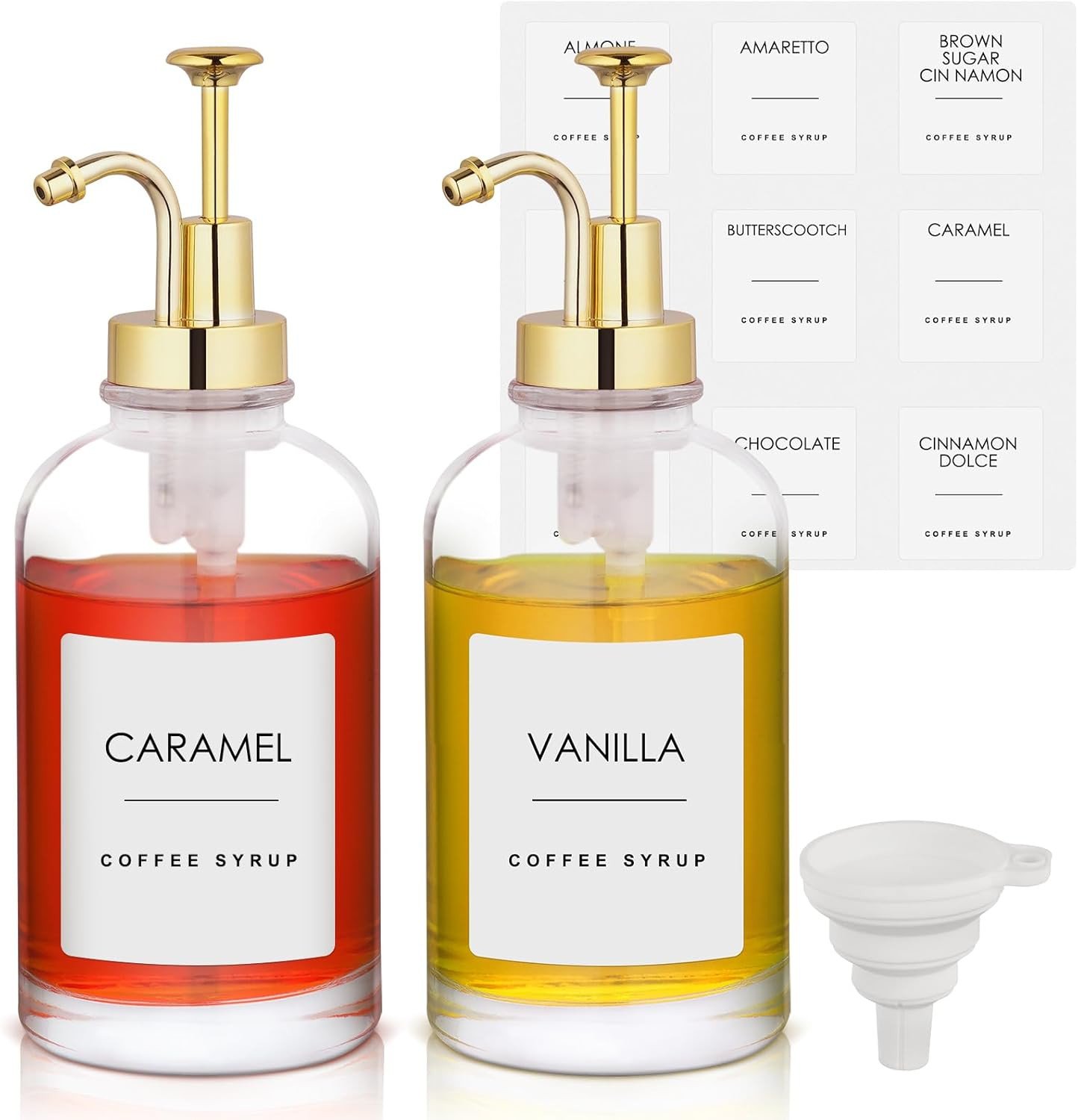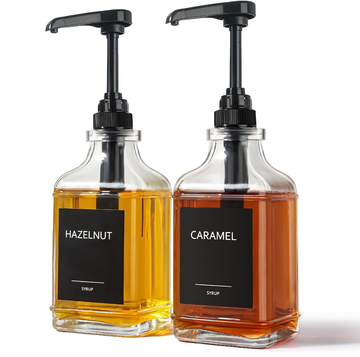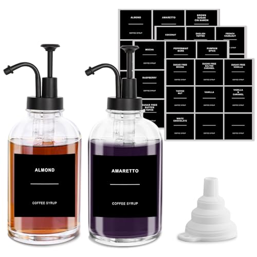 2Pcs Coffee Syrup Dispenser,500ml Syrup Dispenser,Glass Syrup Bottle with Elegant Pumps and 36 Labels and Funnel & Pump,Syrup Pump Dispenser Honey Dispenser,Coffee Syrup Pump,Coffee Bar Accessories