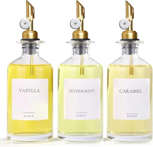 Ezebesta Set of 3 Coffee Syrup Glass Dispenser Bottles 480ml Pump Bottles with 20 Labels for Coffee Bar Organization - PUMP PATENT REGISTERED