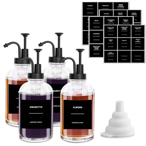 Coffee Syrup Dispenser,Black 500ml/16.9 oz Syrup Dispenser,Set of 4 Glass Pump Bottle with 36 Waterproof Labels and Funnel&Pump for Kitchen Coffee Bar Accessories