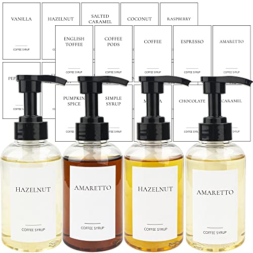 Ezebesta Set of 4 Coffee Syrup Dispenser Bottle 300ml PET Plastic Pump Bottles with Labels for Coffee Bar Station Organization