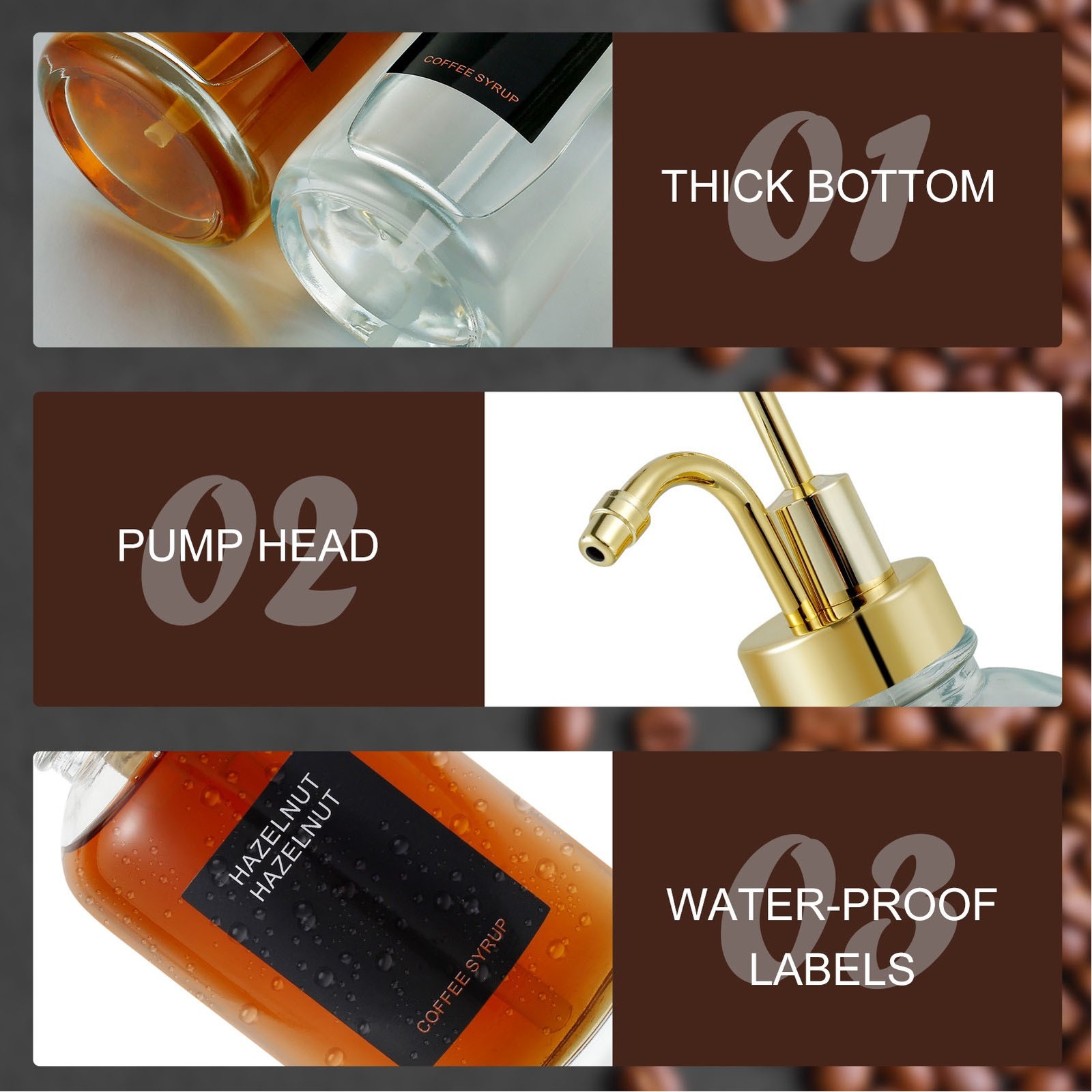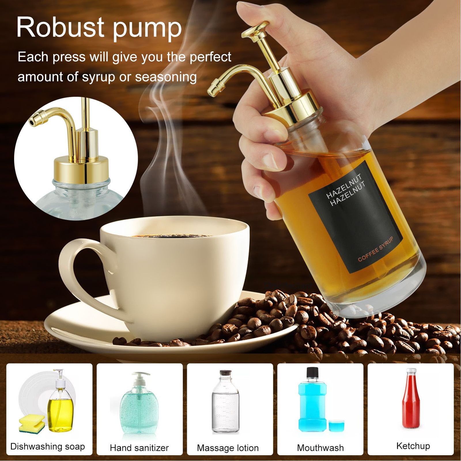 Coffee Syrup Dispenser Coffee Bar, Pump Dispenser W/ Gold Pump & 36 Labels, Glas