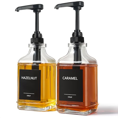 gmisun Syrup Dispenser, 2 Pack 17 Fl oz / 500 ml Square Glass Coffee Syrup Dispenser with Large Capacity Syrup Pump and 36pcs Label Stickers, Modern Coffee Station Accessories for Cafe Bar & Kitchen