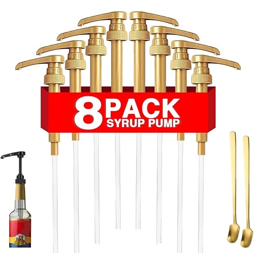 8 Pcs Gold Coffee Syrup Pump Dispenser, Compatible with 25.4 Oz/750ml Bottles, Great for Home & Coffee Bar Drinking Mixes, Tea, Beverage, Cocktails, Plus Spoons