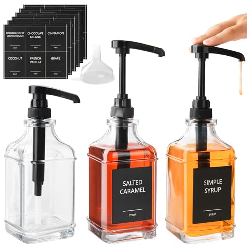 YBCPACK 3Pack 16.9 oz/ 500 ml Coffee Syrup Dispenser, Large Glass Syrup Bottles with Pump for Coffee Bar/Kitchen, Square Coffee Syrup Pump Dispenser with 36pcs Stickers, 1 Funnel