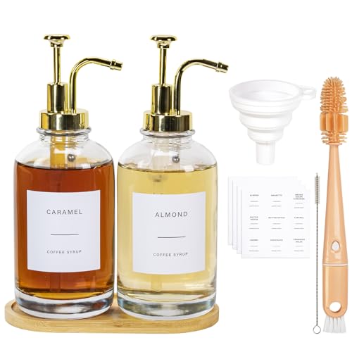 Coffee Syrup Dispenser, 500ml/16.9 oz Glass Syrup Bottle, 2 Pcs Syrup Pump Dispenser with Pump, Contains 36 Labels and Bottle Brush, Funnel, Tray (Gold)