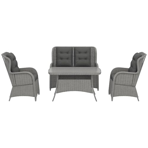 Outsunny Garden PE Rattan Dining Sofa Set, Outdoor 4 Seater Wicker Furniture, High Back Chairs with Cushions, Tempered Glass Coffee Table for Patio, Light Grey