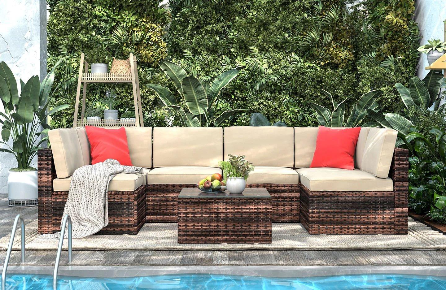 Teamson Home 7 Piece Woven Rattan Patio Sectional with Cushions and Coffee Table