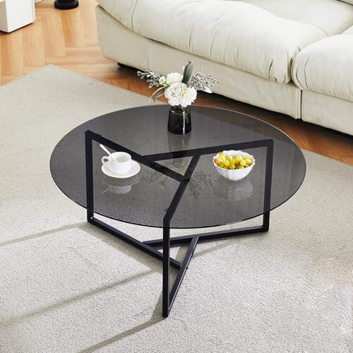 TUKAILAi Round Coffee Table for Living Room, Black Glass Coffee Table with Metal Frame Modern Side End Table for Home Office