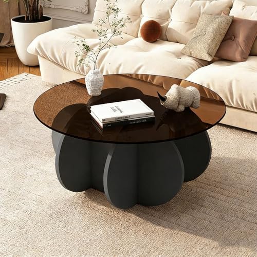 NEHCFO Round Glass Coffee Table with Wood Base, Tempered Glass Top, Easy to Assemble, Modern Coffee Table for Living Room, Small Spaces, Center Table, Minimalist Home Decor(Brown+Black,80cm)