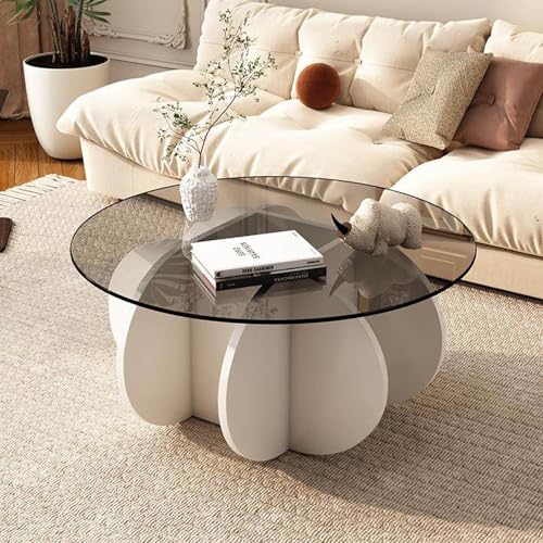 NEHCFO Round Glass Coffee Table with Wood Base, Tempered Glass Top, Easy to Assemble, Modern Coffee Table for Living Room, Small Spaces, Center Table, Minimalist Home Decor(Gray+White,80cm)