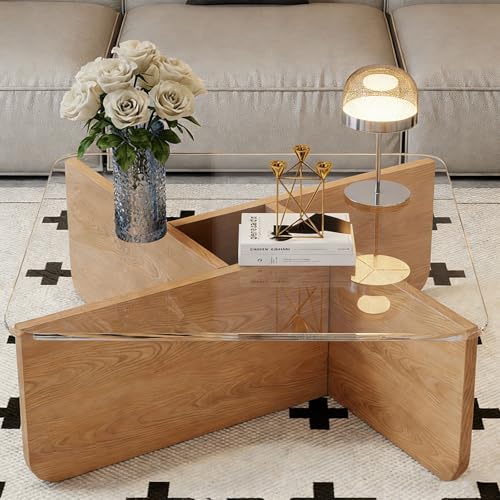 NEHCFO Square Glass Coffee Table with Wood Base, Tempered Glass Top, Modern Coffee Tables for Living Room, Small Spaces, Center Table, Minimalist Home Decor(Color-8,70cm)