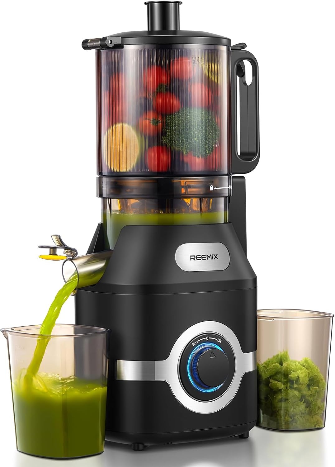 AMZCHEF Cold Press Juicer Machine - 142mm XL Feed Chute for Whole Fruits & Vegetables, Slow Masticating Juicer with Stainless Steel, Triple Strainers & Easy Clean