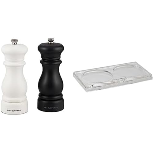 Bundle of Cole & Mason Southwold Black & White Salt and Pepper Mill Set, Adjustable Grind, ABS Plastic, 165mm + Cole & Mason Ramsgate Clear Salt and Pepper Mill Tray, Acrylic