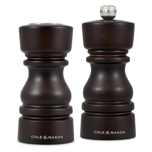 Cole & Mason London Salt and Pepper Shaker & Mill Gift Set, 130mm / 5in Chocolate Wood Grinder, Sharp Ceramic Grinding Mechanism