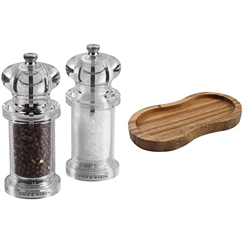 Cole & Mason H50518P 505 Clear Salt and Pepper Mills | Precision+ | Acrylic | 140mm & T&G 10469 Tuscany Acacia Double Mill Rest / Work Surface and Dining Table Protector, 16 x 9 x 1.5 cm, Brown
