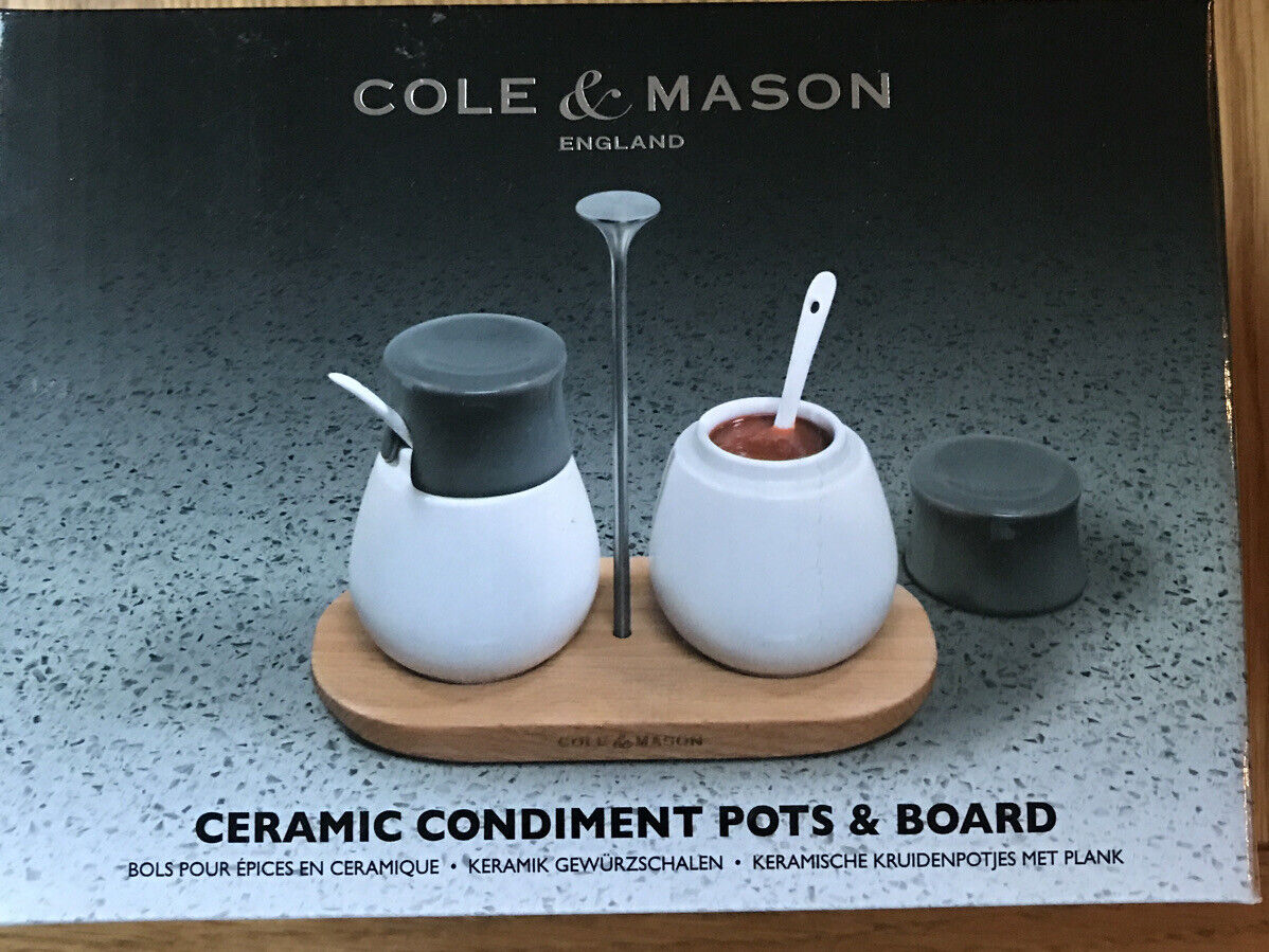 Cole & Mason Condiment Pots & Board With Spoons Wood White Grey Ceramic