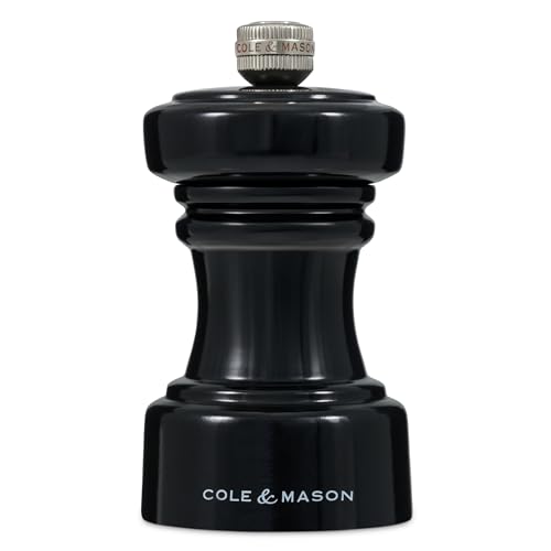 Cole & Mason Hoxton Black Gloss Pepper Mill, Precision+ Carbon Mechanism, Compact Pepper Grinder with Adjustable Grind, Beech Wood, 104mm, Seasoning Mill, Lifetime Mechanism Guarantee