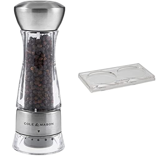 Cole & Mason H59301G Windermere Pepper Mill | Gourmet Precision+ | Stainless Steel/Acrylic | 165mm| Includes 1 x Pepper Grinder & H306119 Ramsgate Clear Salt and Pepper Mill Tray | 13mm x 95mm x 157mm