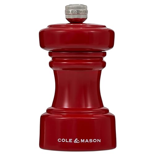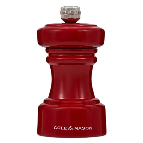 Cole & Mason Hoxton Red Gloss Pepper Mill, Precision+ Carbon Mechanism, Compact Pepper Grinder with Adjustable Grind, Beech Wood, 104mm, Seasoning Mill, Lifetime Mechanism Guarantee