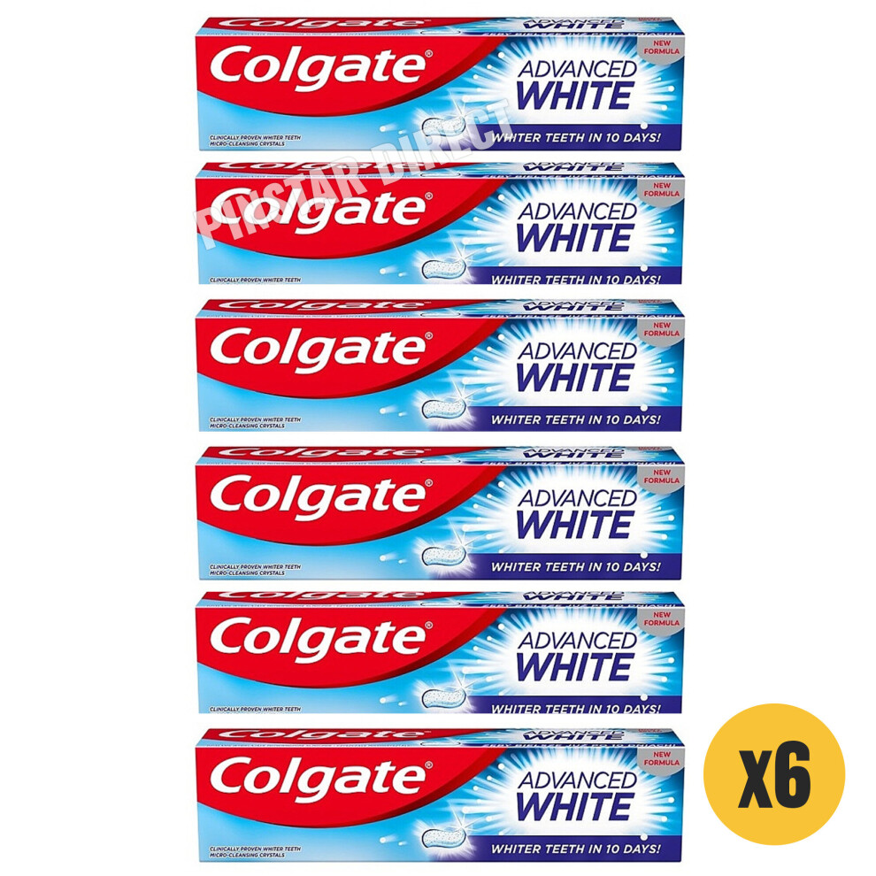 Colgate Advanced White Toothpaste, 6 x 75 ml - Whiter teeth in 10 Days - Clinically proven whitening - Teeth whitening toothpaste with micro-cleansing crystals - Mint toothpaste