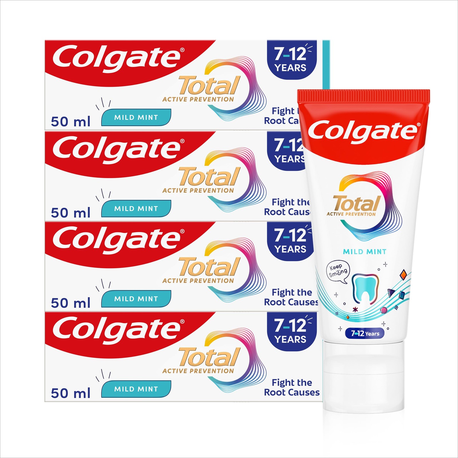 Colgate Total Kids 7-12 Years Mild Mint Toothpaste 50ml x4 Multipack - for New Permanent Teeth - Fights Root Causes² of Many Oral Health Problems - Sugar Acid Protection³ - Suitable for Braces