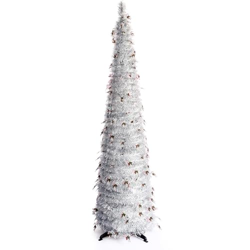 5Ft/1.5M Pop Up Collapsible Christmas Tree with Lights, Silver Tinsel Skinny Pe