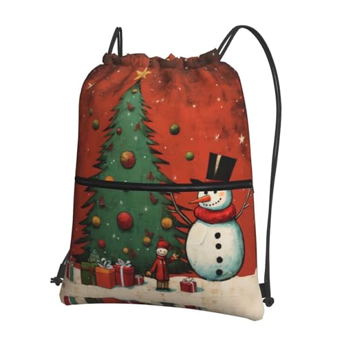 DIEzig snowman Christmas Tree Print Adjustable Strap Backpack, Collapsible Drawstring Bag with Zipper for Weekend Adventure