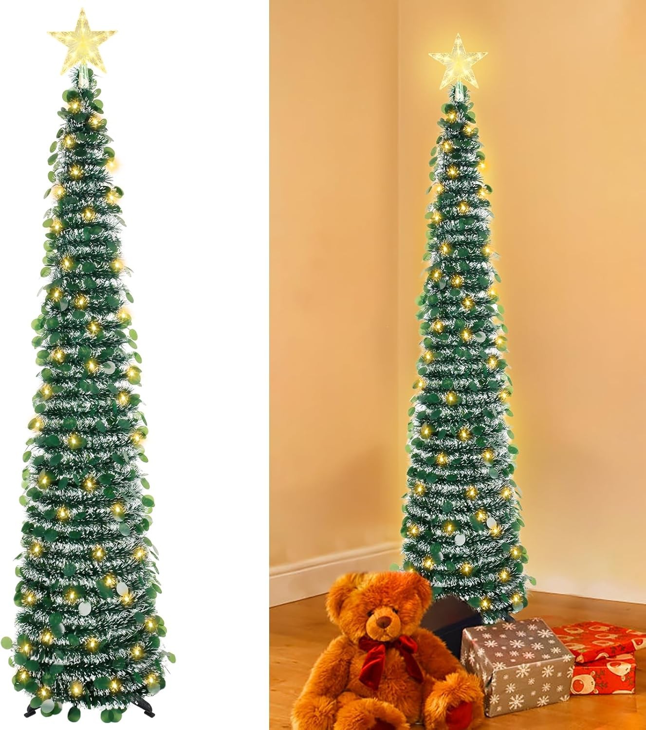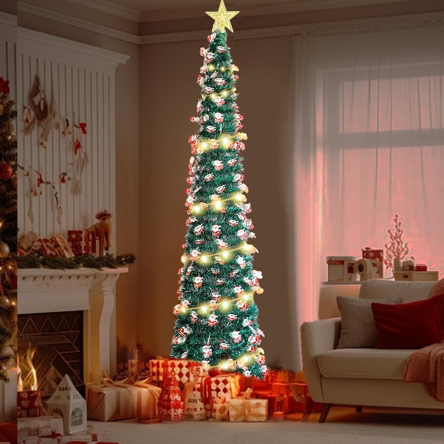 PUZYI Holidays Christmas Tree with Lights & Balls, 5Ft Collapsible Tree Decorations, Artificial Pencil Trees Skinny Tree for Holiday Xmas Decorations(2.1m)