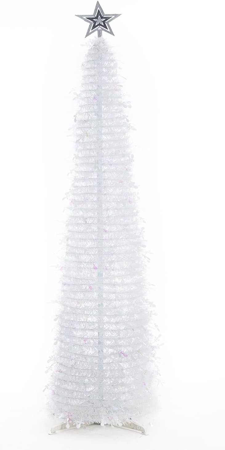 BrilliantJo Christmas Tree 5ft Artificial with Light and Topper Star Pop Up Collapsible Stand Tinsel Shiny Sequins for Xmas Holiday Party Decorations, Home Office Display, 150cm, White