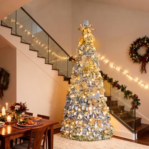 Uten 6FT/1.8m Collapsible Pop Up Christmas Tree, Artificial Snow Flocked Christmas Tree with 300 LED Warm Lights, 8 Lighting Modes, Bow, 50 Christmas Balls, Party and Indoor/Outdoor Home Decoration