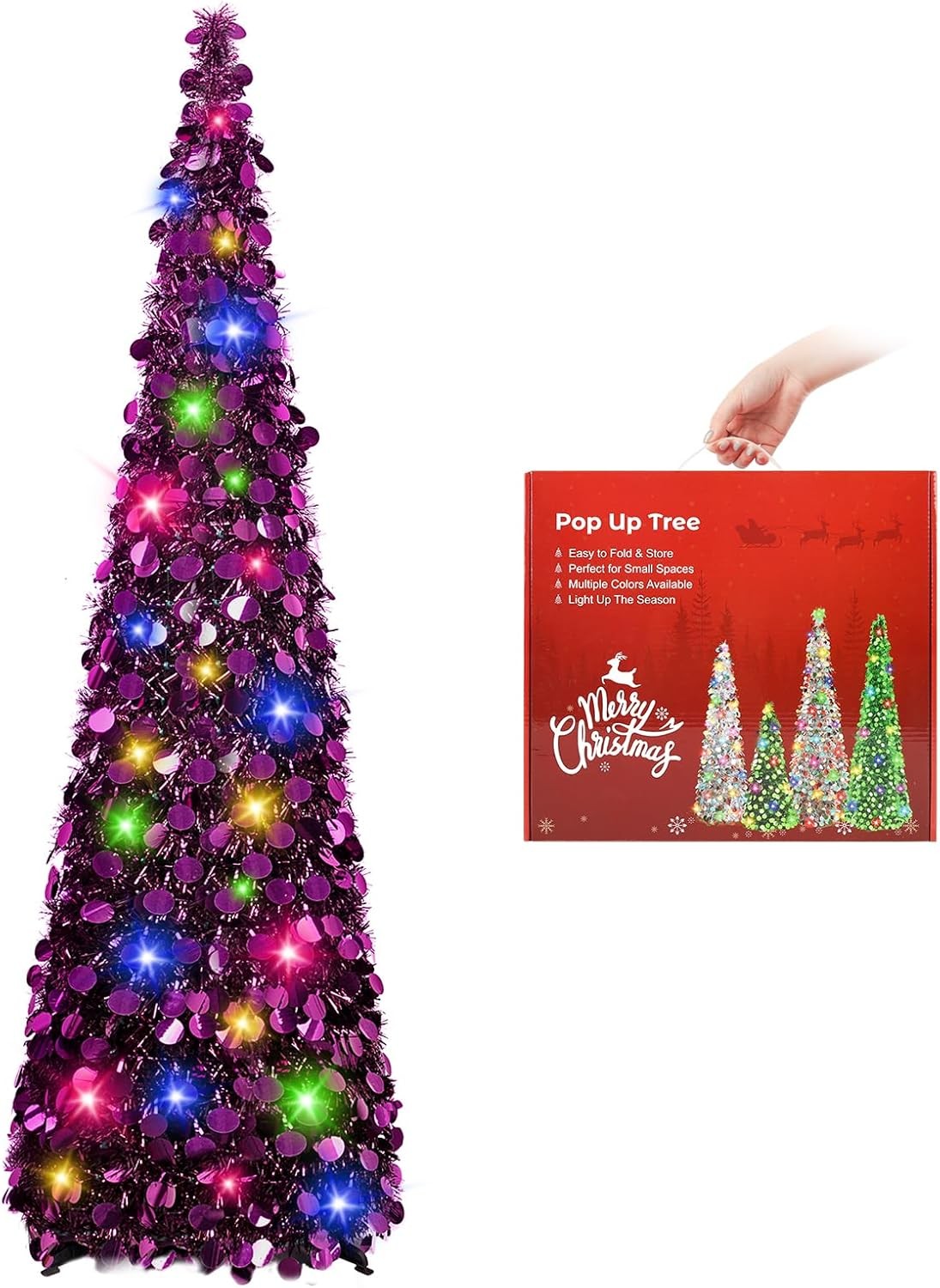 Battery Operated LED Lights Tinsel Tree With Lights 5 Ft Artificial Christmas Tree Pop Up Collapsible Christmas Tree Portable Holiday Decoration
