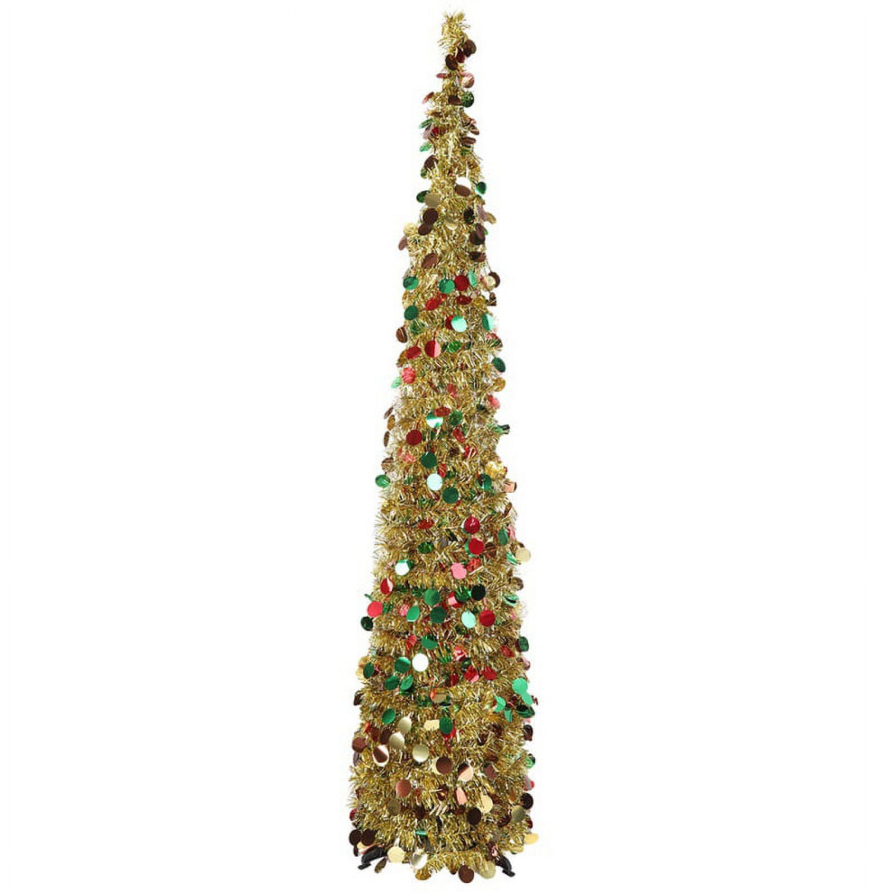BrilliantJo Christmas Tree 5ft Artificial with Light and Topper Star Pop Up Collapsible Stand Tinsel Shiny Sequins for Xmas Holiday Party Decorations, Home Office Display, 150cm, Gold