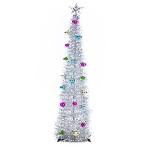 5ft Pop Up Christmas Tinsel Tree with Stand, Gorgeous Collapsible Artificial Christmas Tree for Christmas Decorations, Colorful Silver
