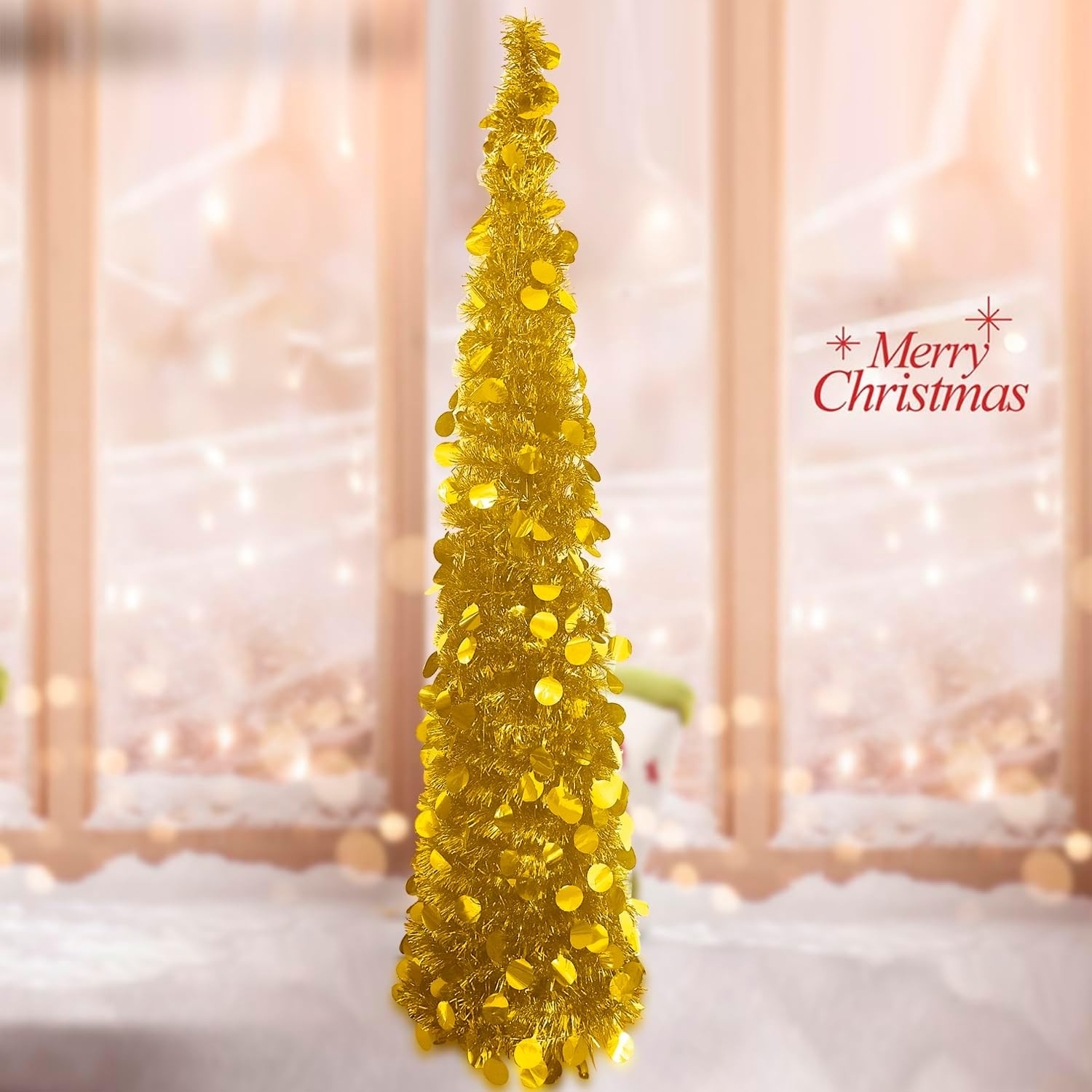 Warmiehomy 5ft/150cm Collapsible Christmas Tree Glittering Pencil Christmas Trees with Sequin Artificial Pop up Tinsel Tree Christmas Decorations for Home, Store, Office, Golden