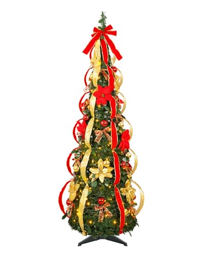 Uten 6FT/1.8m Collapsible Pop Up Christmas Tree, Artificial Christmas Tree with 300 LED Warm Lights, 8 Lighting Modes, 24 Christmas Balls, Christmas Flowers, Bow, Ribbon, Indoor/Outdoor Decoration