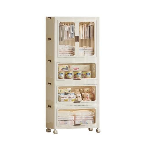 Collapsible Wardrobe, Portable Cabinet, Plastic Folding Chest of Drawers with Clothes Rail, Wardrobe with Double Doors, Foldable Multipurpose Cabinet with Wheels (1 Hanger + 1 Storage)
