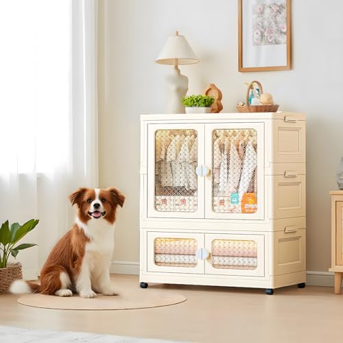 Collapsible Wardrobe, Portable Cabinet, Plastic Folding Chest of Drawers with Clothes Rail, Wardrobe with Double Doors, Foldable Multipurpose Cabinet with Wheels (1 Hanger + 3 Storage)