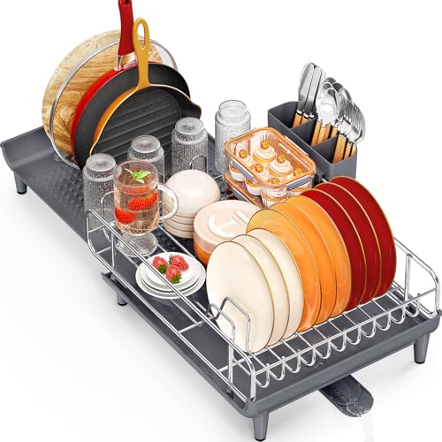 Extendable Dish Rack, Dish Drying Rack for Kitchen Counter, Foldable Dish Dryer Rack, Stainless Steel Dish Drainer Racks with Utensil Holder, Collapsible Dish Drying Racks Large Size, Grey