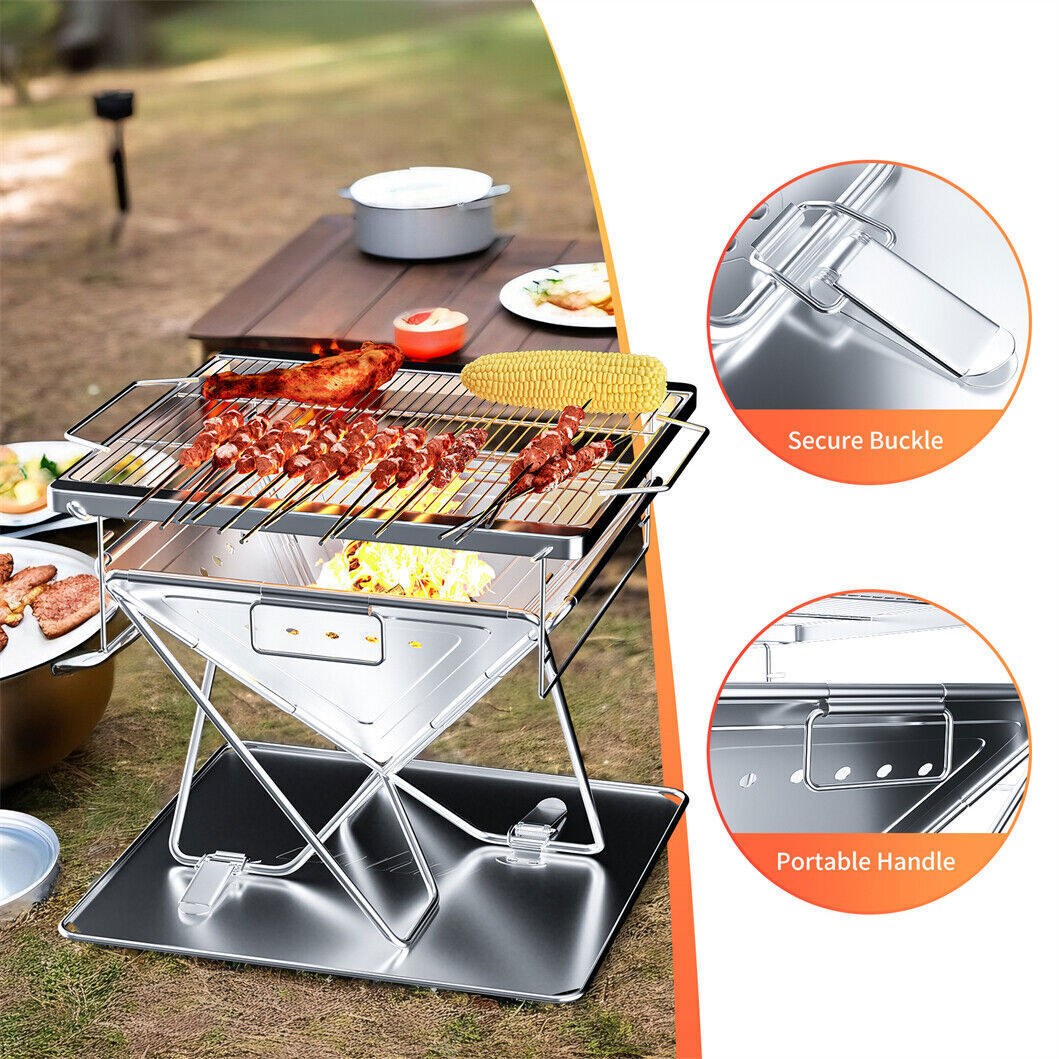 Hanviter Portable Fire Pit for Camping: Collapsible Stainless Steel Grill with iron Carry box, BBQ Camping stove for Picnics, Barbecue, Bonfire, Patio, Backyard, Garden Outdoor