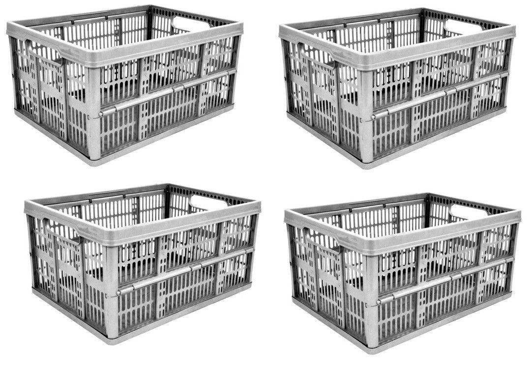 4X Folding Crates Silver 32L Plastic Collapsible Stackable Crates Storage Boxes