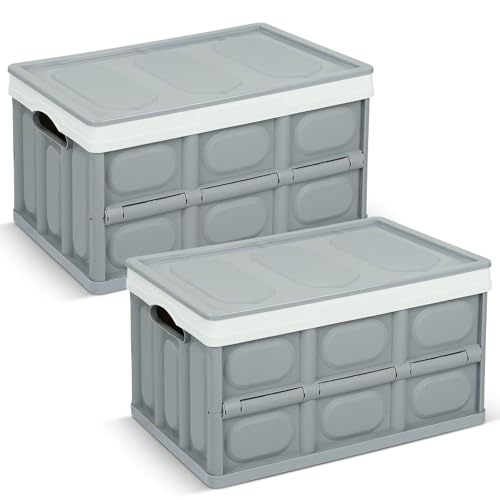 Tuevob 2 Pack Collapsible Storage Boxes Crates 30L Lidded Storage Bins Plastic Tote Storage Box Container Stackable Folding Utility Crate for Clothes, Books,Snack, Shoe Grocery Storage Bin-Grey