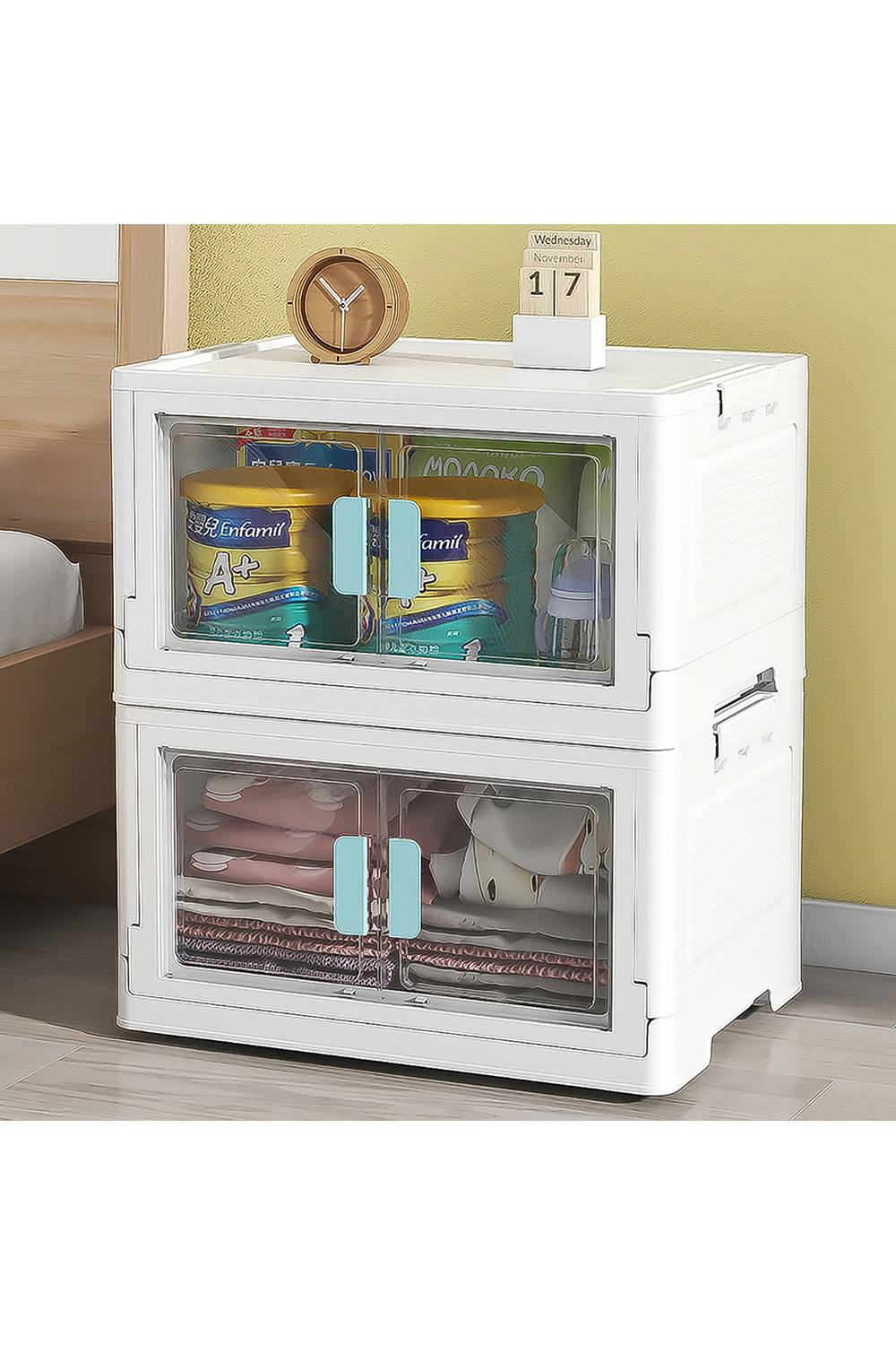 Collapsible Clothes Cabinet,4 Tier Stackable Storage Bins With Lid And Side Carry Handle,Folding Plastic Storage Boxes Containers With Doors And Wheels Two Opening Ways For Bedroom Kitchen