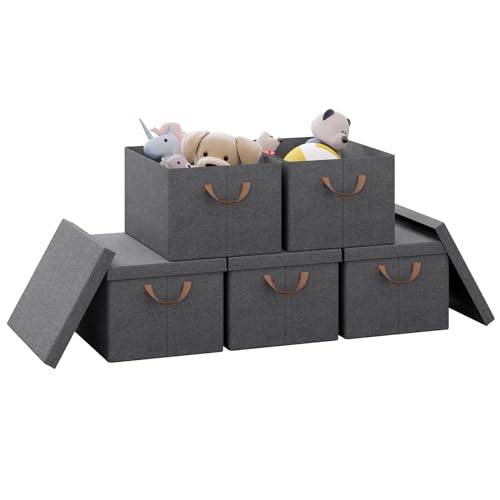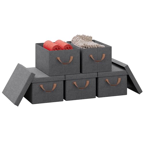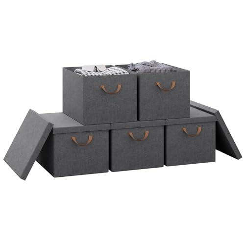 WOLTU Collapsible Storage Boxes Set of 5, Non-Woven Fabric Storage Boxes with Removable Lid, Handles, Metal Frame, 36L, Grey, 43x33x26cm, ABB03gbn-5-UK