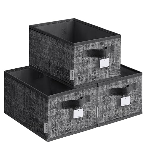 SONGMICS Collapsible Storage Boxes, Set of 3 Fabric Storage Baskets, 30 x 20 x 15 cm, Wardrobe Storage Organisers, 2 Handles, Label Holders, for Bedroom, Living Room, Ink Black ROB415B01