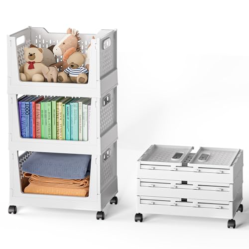 BTGGG 3 Pack Wardrobe Storage Organiser with Wheels Stackable Wardrobe Shelves Collapsible Storage Boxes Movable Storage Cart for Closet, Cabinet, Pantry, Laundry Kitchen Study Room Organization