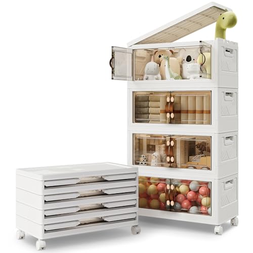 Esenlong 4-Tier Stackable Storage Boxes with Wheels,Plastic Storage Bins with Lid,Storage Drawers with Front Door,Collapsible Storage Cabinet for Bedroom Living Room Study Office